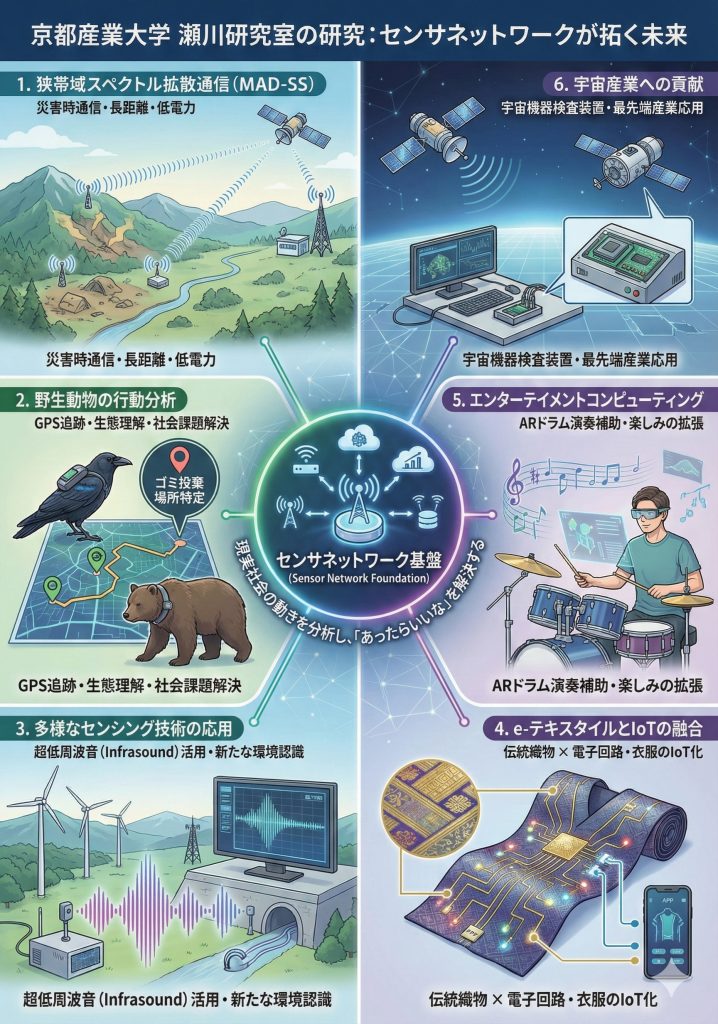 瀬川研究室は、センサー、ネットワーク、そして伝統技術や新しいアイデアを掛け合わせることで、環境モニタリングからエンターテイメント、宇宙産業まで、非常に幅広い分野での社会貢献を目指している研究室です。